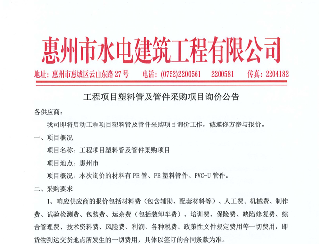 廣東省惠州市中心城區地下管網系統提升工程—雨水管網建設項目、惠州市增江龍門段治理工程施工(二標段)塑料管及管件采購項目詢價公告……